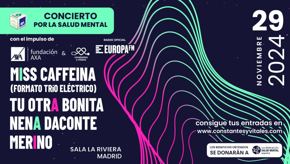 Miss, Caffeina, Nena Daconte, Tu otra bonita y Merino son los artistas confirmados para esta cita solidaria que contará con la periodista y presentadora de laSexta Mamen Mendizábal, también embajadora de Constantes y Vitales, como conductora. Las ya pueden adquirirse y los beneficios que se consigan con su venta se destinarán a la Confederación SALUD MENTAL ESPAÑA.