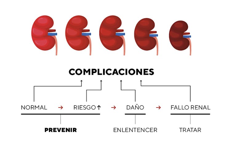 Esta enfermedad tiene etapas que van de inicial o leve, a moderada, avanzada y al fallo que precisa diálisis. Con frecuencia el fuego empieza pequeño y va ganando fuerza hasta quemar el bosque. Por eso es importante detectarlo pronto y tratarlo.