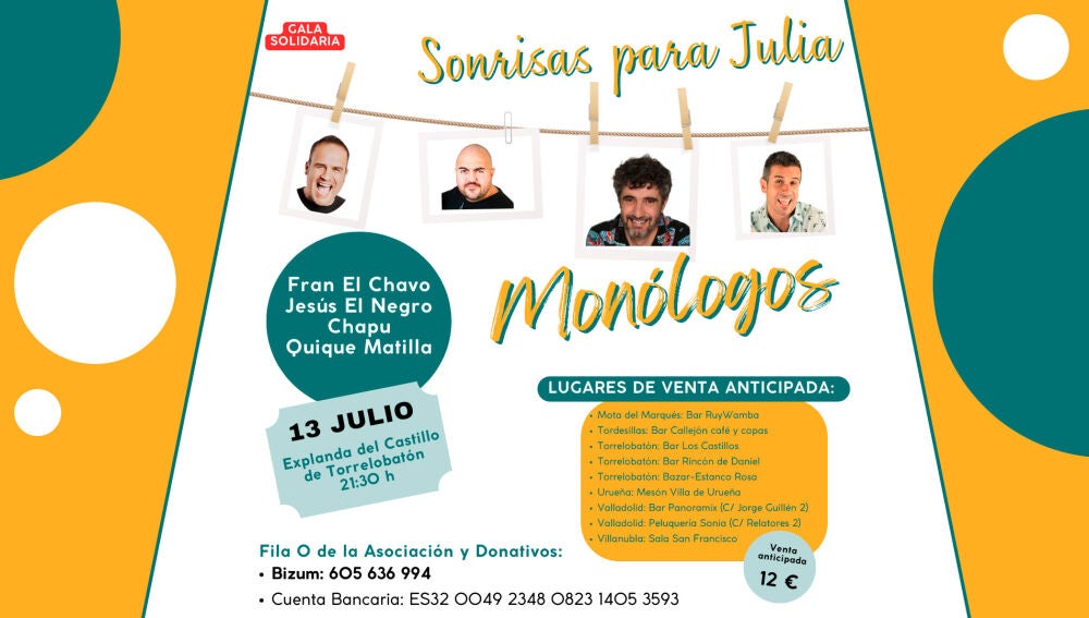 El próximo 13 de julio se celebra la gala solidaria 'Sonrisas para Julia' en la que humoristas como Fran El Chavo, Chapu, Quique Matilla y Jesús el Negro ofrecerán monólogos a los asistentes a este evento benéfico a favor de Julia.