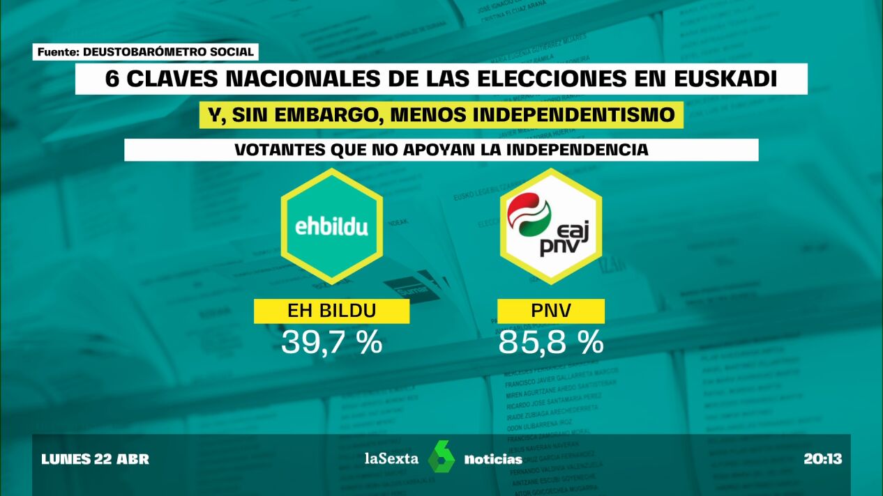 Es cierto que PNV y Bildu suman más votos que nunca y ambos se definen como soberanistas, pero los datos muestran que sus votantes no quieren la independencia de Euskadi. Del electorado del PNV no la quieren más del 80%, mientras que en el de EH Bildu un 40% no está ya por la labor. Estos datos pertenecen al último Deusto-barómetro de hace solo unos meses.