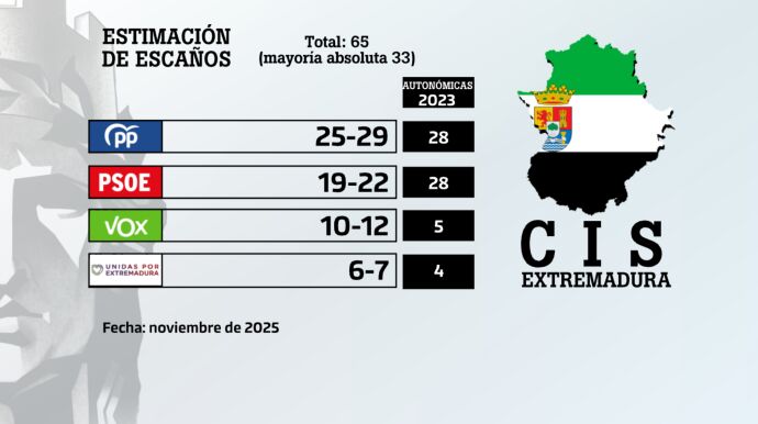 El PP obtendría entre 25 y 29 escaños en la Asamblea de Extremadura en las elecciones autonómicas anticipadas del 21 de diciembre, según el estudio preelectoral del CIS publicado el pasado 28 de noviembre por lo que no lograría la mayoría absoluta, fijada en 33 diputados, y necesitaría la abstención o el apoyo de otra formación para gobernar, previsiblemente el de Vox. Mientras, el PSOE se desplomaría con entre 19 y 22 escaños, mientras que en la actualidad tiene 28. Por su parte, Vox duplicaría sus cinco actuales, pasando a tener entre 10 y 12 escaños, según el CIS de Tezanos, y Unidas por Extremadura —Unidas Podemos, IU y Alianza Verde— que ahora tiene cuatro, subiría hasta los seis o siete representantes.