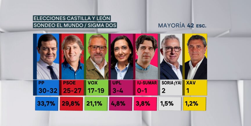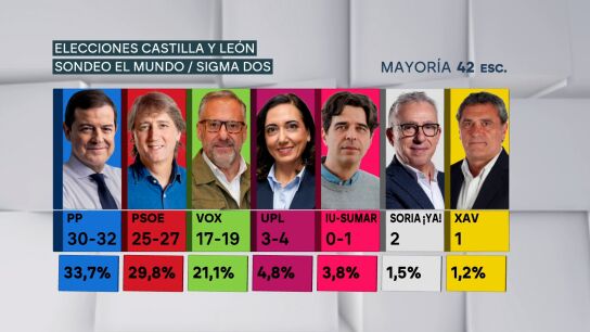 Según el sondeo elaborado por Sigma Dos para 'El Mundo', el Partido Popular, liderado por Alfonso Fernández Mañueco en esta comunidad, aumentaría su porcentaje de voto un 1,2 puntos porcentuales y podría subir un escaño, llegando hasta los 32. Lo mismo apunta la de NC Report para 'La Razón', que señala una menor subida de un 0,5%. No obstante, para poder gobernar con mayoría absoluta, seguiría dependiendo de Vox, que sería el más beneficiado de estos comicios.