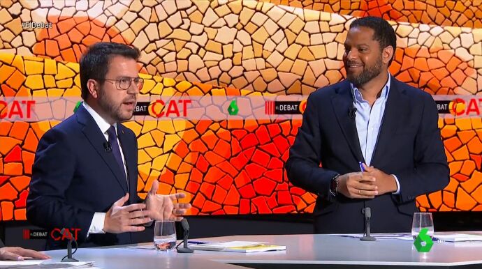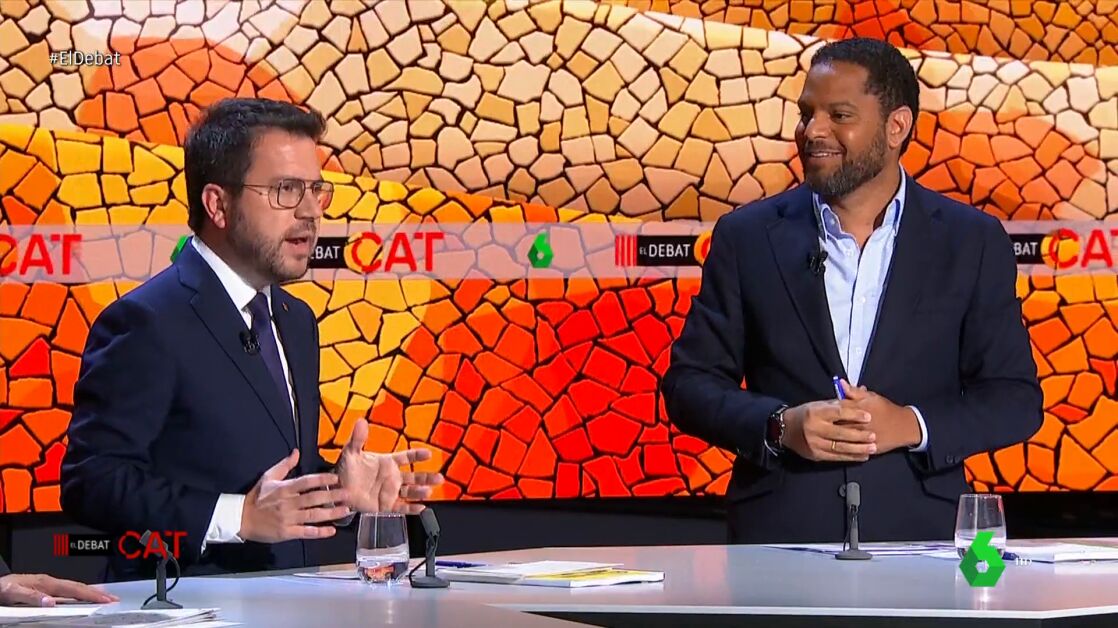El candidato de Vox le ha dicho a Aragonès que "garantiza antes el árabe que el español" en las escuelas de Cataluña. "¿Por qué sí el árabe y no el español?", le ha preguntado, a lo que el actual president le ha respondido que si visitara las escuelas catalanas, vería "cuál es la realidad".