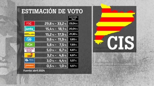 Por otro lado, el Partido Popular sería cuarta fuerza con una estimación entre 9,6 y el 11,9% y VOX se quedaría entre el 5,8 y el 7,5% de estimación en porcentaje de voto. La misma encuesta da para Comuns Sumar entre el 5 y el 6,7%, mientras que la CUP se haría con entre un 3,2 y un 4,6%. Por otro lado, la formación de extrema derecha independentista Aliança Catalana obtiene entre el 3 y 4,4 %, por lo que podría entrar en el Parlament.
