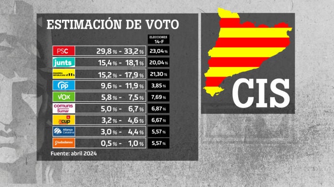 El PSC lograría entre el 29,8 y el 33,2% de votos, según este último estudio del CIS de Tezanos. Junts se sitúa como segunda fuerza y alcanzaría entre el 15,4 y el 18,1% y ERC tendrían entre el 15,2 y el 17,9%.