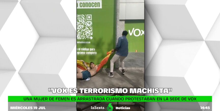 A la vez, en la bandera de España se podía leer 'Negar el machismo nos mata' o 'Vox, el partido del terrorismo machista'. Mientras las activistas estaban agarradas a una bandera de España con la frase, el trabajador del partido ha agarrado la bandera para alejarlas de la sede y, aunque una de las integrantes que la sostenía había caído al suelo, el varón ha continuado tirando y la ha arrastrado unos metros.