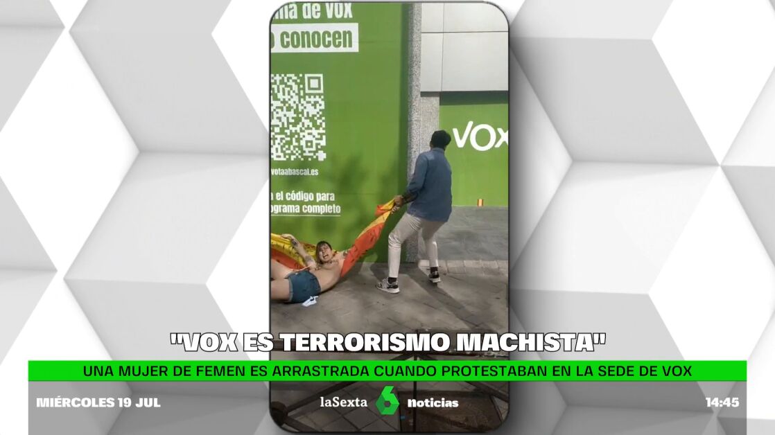 Activistas de Femen han protestado este martes frente a la sede de Vox contra la violencia de género. Con el torso desnudo como es habitual, han usado una bandera de España como pancarta y en ella han escrito lemas contra el machismo. Durante la protesta, un trabajador del partido salió del edificio y ha intentado echarlas arrastrando por el suelo a una de ellas.