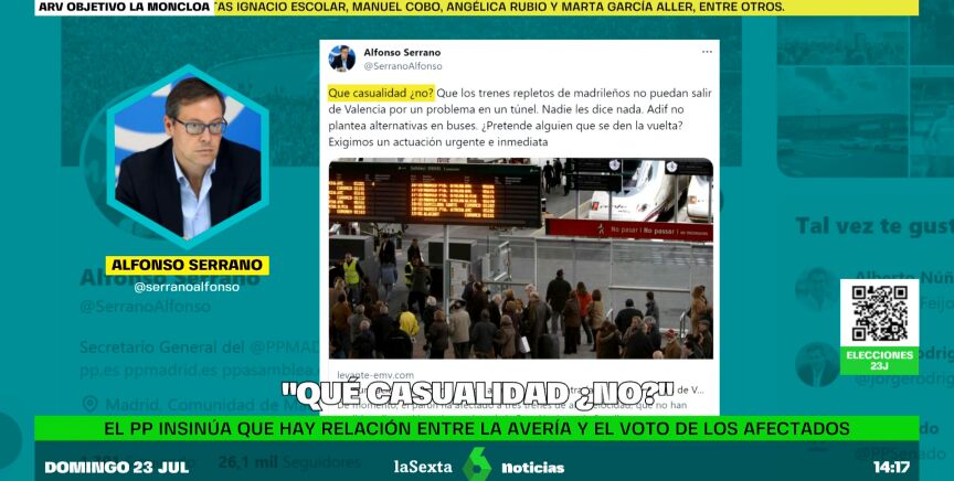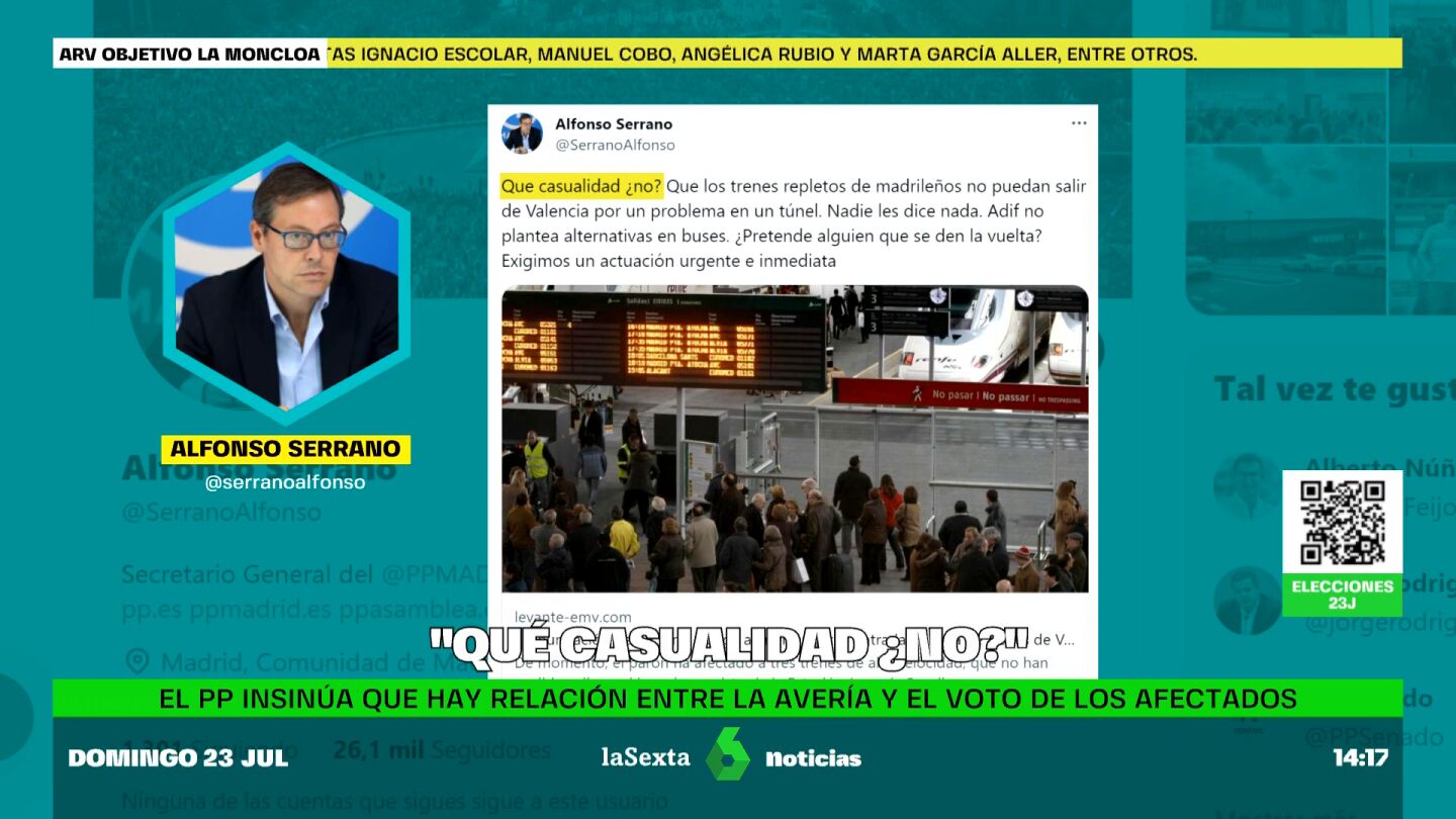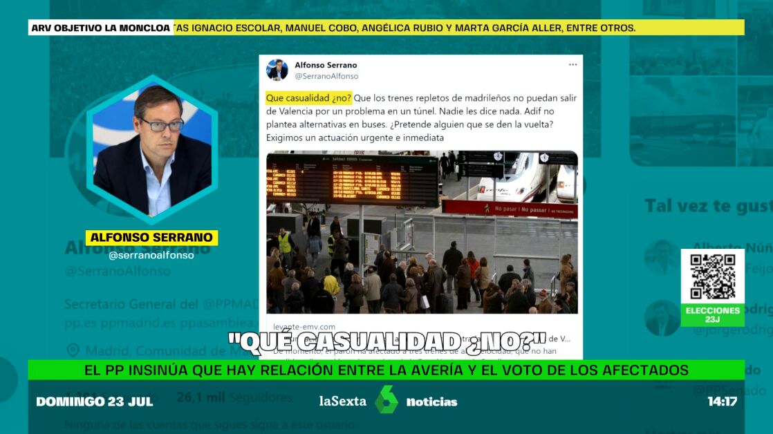 "Qué casualidad ¿no? Que los trenes repletos de madrileños no puedan salir de Valencia por un problema en un túnel. Nadie les dice nada. Adif no plantea alternativas en buses. ¿Pretende alguien que se den la vuelta?", ha publicado Alfonso Serrano, secretario General del PP en Madrid, tras lo que ha exigido "una actuación urgente e inmediata".