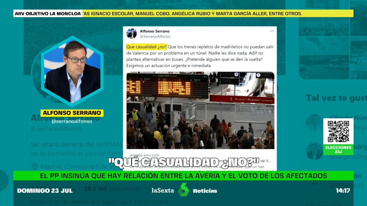 El PP ha aprovechado la avería que ha provocado que se suspenda la circulación de trenes entre Valencia y Madrid para deslizar sospechas de boicot. Dirigentes populares como Alfonso Serrano han ironizado con que es "una casualidad" que el incidente se produzca justo en el día en el que muchos madrileños tenían previsto volver.