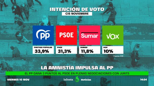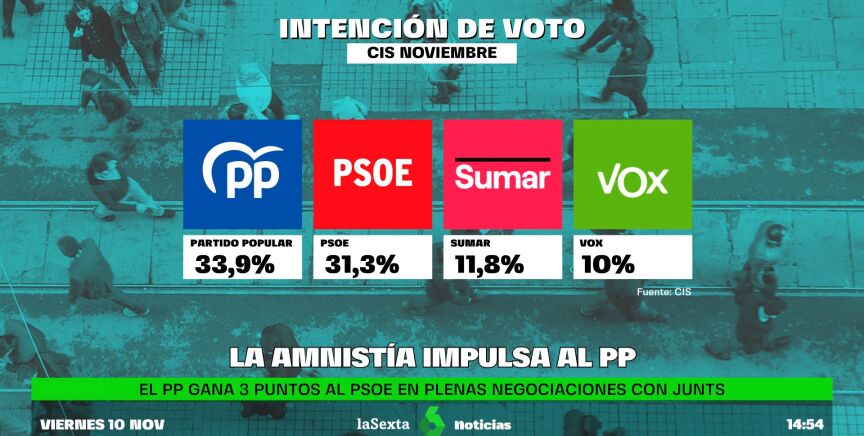El Barómetro de Opinión realizado por el Centro de Investigaciones Sociológicas (CIS) a principios de noviembre sitúa al PP con una ventaja de 2,6 puntos sobre el PSOE, que pierde punto y medio en un mes marcado por las negociaciones de la amnistía.