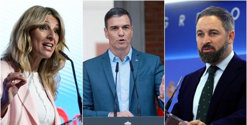 Sí se verán las caras el presidente del Gobierno y candidato socialista, Pedro Sánchez, la vicepresidenta segunda del Gobierno y líder de Sumar, Yolanda Díaz, y el candidato de Vox, Santiago Abascal.