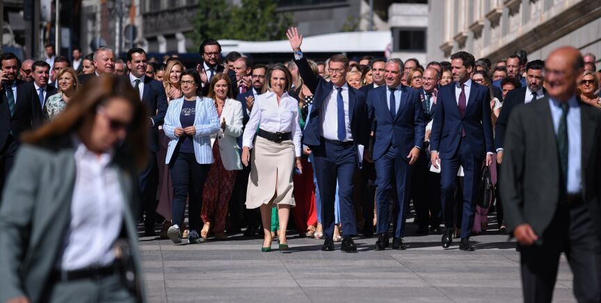 Así, con Cuca Gamarra a su derecha y Elías Bendodo a su izquierda, y seguidos los tres por toda una masa de populares, ha querido Núñez Feijóo recordar que fue el ganador de las elecciones generales celebradas el pasado 23 de julio, si bien sus números no han sido suficientes para lograr formar gobierno con otras fuerzas parlamentarias (necesita más de la mitad de los apoyos de la cámara para poder ser presidente).