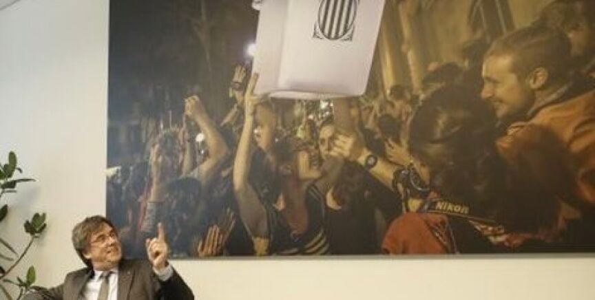 Se trata de un cuadro de dimensiones importantes que ocupaba toda una pared de la sala en la que se producía el encuentro. Una gran fotografía que muestra a una mujer rodeada de manifestantes y transportando una urna del referéndum del 1-O.
