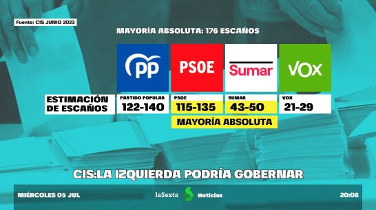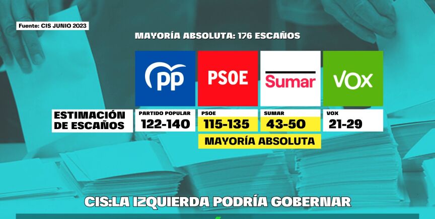 En tercer lugar se situaría Sumar, que, con el 16,4% del voto, lograría entre 43 y 50 escaños (Unidas Podemos se quedó en 35 representantes las pasadas elecciones). En cuarto lugar quedaría Vox, con el 10,6% del voto, bajando hasta entre 21 y 29 escaños. Como ha sucedido con las autonómicas y municipales del 28M, estas elecciones vienen definidas por la política de pactos que han consolidado dos grandes bloques a día de hoy, el conservador y el progresista. Por tanto, es especialmente relevante comprobar las sumas de cada espacio en el tablero para ver las posibilidades de gobierno reales.