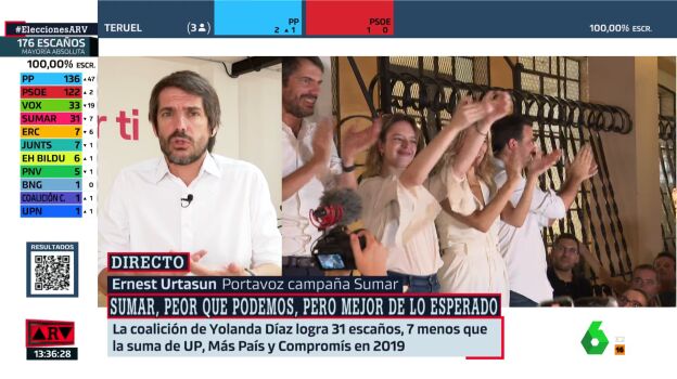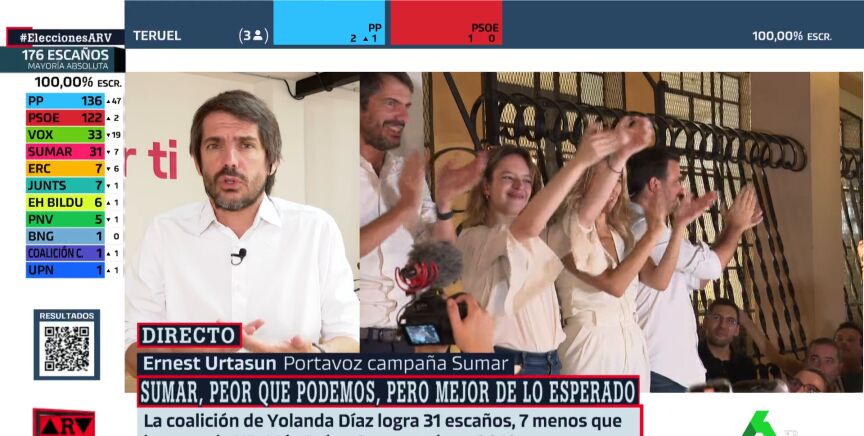 En una entrevista en Al Rojo Vivo el día después de las elecciones generales, Ernest Urtasun, portavoz de Sumar, ha llamado a "trabajar ya" para hacer la investidura de Sánchez posible "porque es la única viable": "No creo en la repetición electoral", ha señalado.