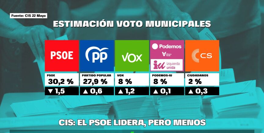 El PSOE ganaría las elecciones municipales del 28 de mayo con el 30,2% de los votos en el total nacional, muy seguido del PP, con el 27,9%. Así se desprende de la encuesta 'flash' publicada este lunes por el Centro de Investigaciones Sociológicas (CIS), que a seis días de la celebración de los comicios marca una diferencia de 2,3 puntos entre socialistas y populares. En esta línea, según los datos arrojados por este barómetro de mayo, la candidatura de Podemos, IU, En Comú Podem, Elkarrekin o En Común Podemos, entre otros, obtendría un 8% en estimación de voto, mismo resultado que Vox.