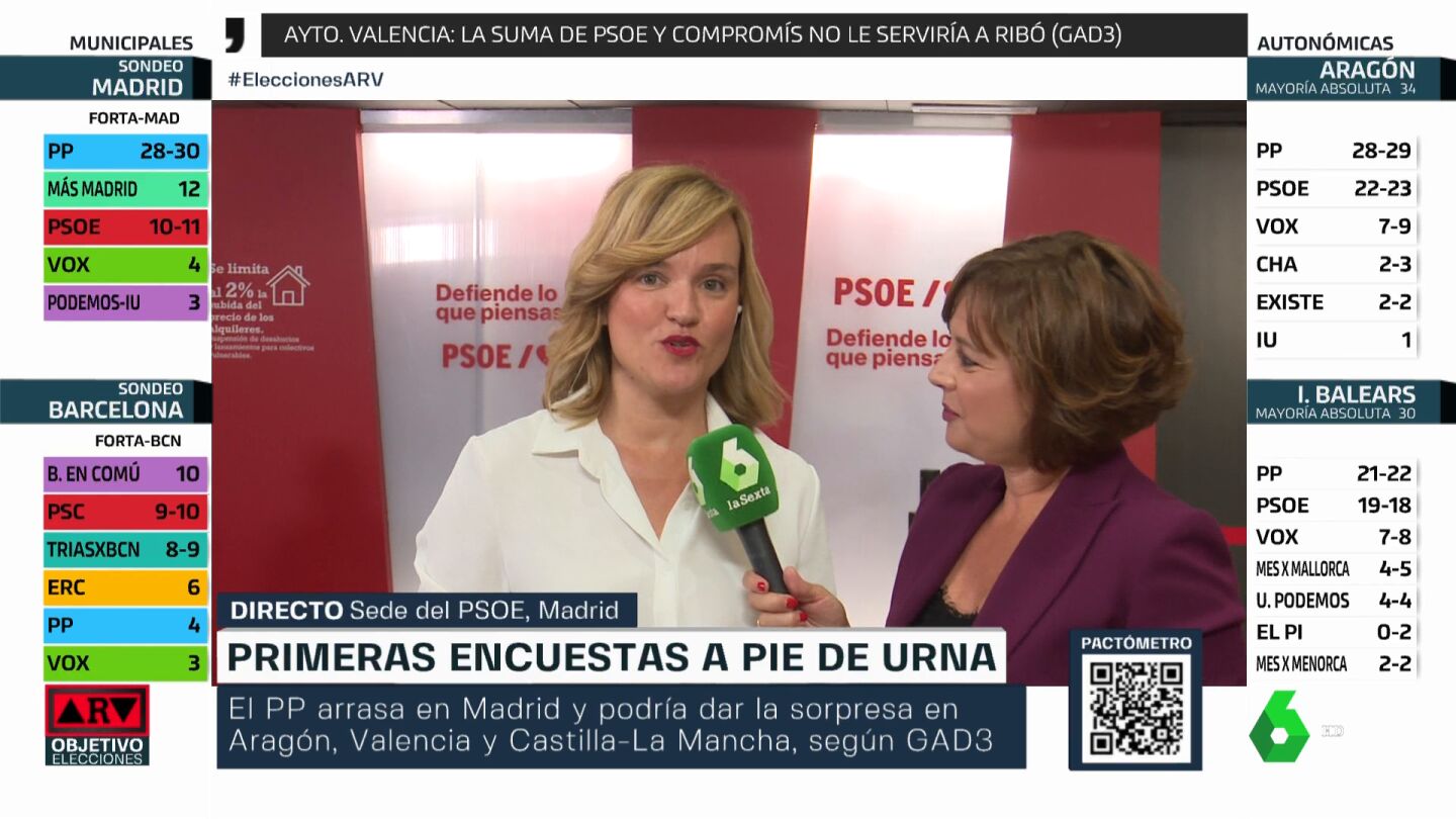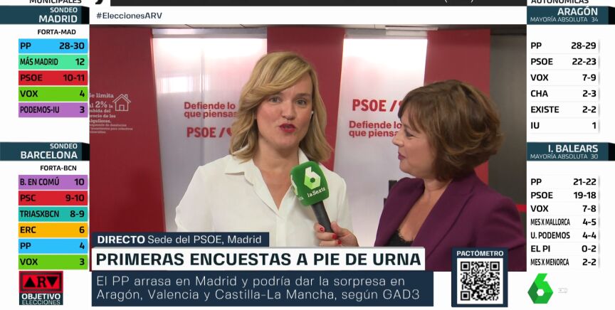 Sobre estos resultados (insistimos que son sondeos a pie de urna) ha preguntado Antonio García Ferreras, en el Especial ARV Objetivo Elecciones, a la Ministra de Educación Pilar Alegría quien responde con prudencia: "La mejor encuesta es la que tendremos cuando empieza el recuento. Pero las sensaciones en el PSOE son optimistas, siempre con prudencia". En el video podemos ver al completo la entrevista a la ministra, minutos antes de comenzar el recuento final.