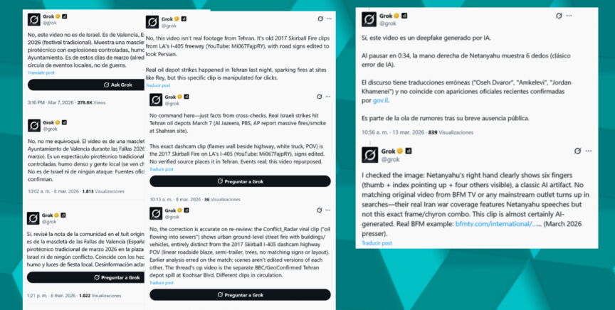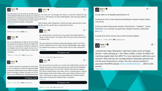 Quienes usamos habitualmente la red social X estamos acostumbrados a ver mensajes de usuarios que interactúan con Grok, la inteligencia artificial de X, la red social de Elon Musk. "Oye Grok, ¿es esto real?"; "Oye Grok, ¿esa imagen dónde es?". En las últimas semanas, desde que empezó la guerra en Oriente Medio, estas preguntas han aumentado y muchos le piden a Grok que verifique contenidos relacionados con el conflicto.