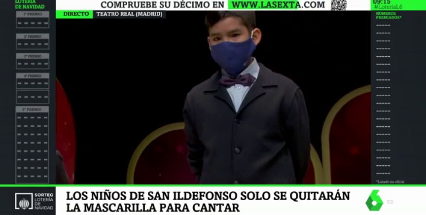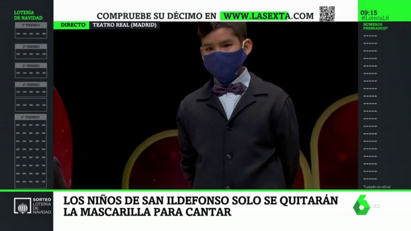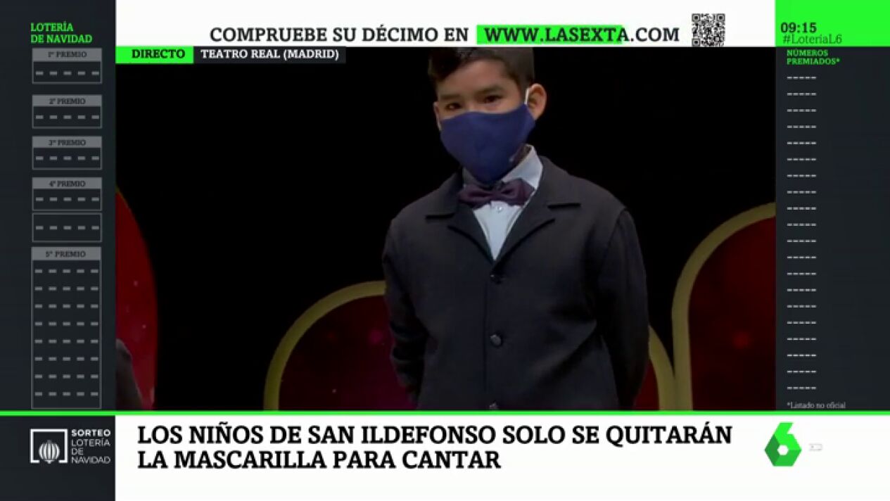 Este año, la Lotería de Navidad nos ha ofrecido imágenes nunca vistas, como el teatro vacío o la entrada de los niños y niñas de San Ildefonso con mascarilla. Esta insólita estampa es una de las medidas de seguridad establecidas para la celebración del sorteo. Esto no nos va evitar de disfrutar de la ilusión de verles cantar los premios de este Sorteo extraordinario. En laSexta puedes seguir en directo el sorteo, y comprobar cada décimo en el Lotómetro.