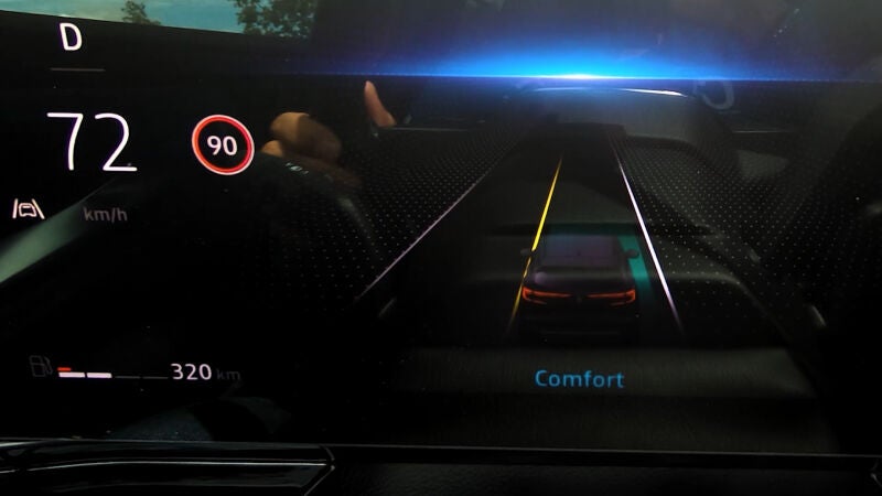 La principal función de un asistente como este es mantener la velocidad programada, siempre respetando la distancia de seguridad si detecta un coche delante. Y a su vez, asistiendo al conductor en la dirección. Porque es capaz de mantener el coche en su carril, e incluso de tomar curvas. Pero no te confíes, si el sistema nota que no tienes las manos en el volante, te avisa con señales sonoras y visuales para que vuelvas a ponerlas en su sitio. No olvidemos que, en España por lo menos, conducir sin las manos en el volante se considera infracción.