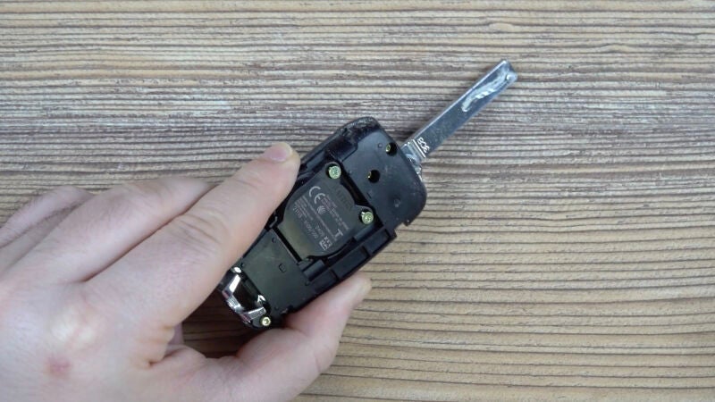El primer paso es identificar cómo se abre la llave. Algunos tienen un pequeño tornillo que los asegura, mientras que otros pueden abrirse introduciendo un destornillador por una pequeña ranura. Suele estar debajo de la llave, por lo que ábrela y búscalo. En nuestro caso encontramos una hendidura por la que introducir un destornillador y hacer palanca. Debes ir poco a poco por el borde de la llave hasta que salga la tapa.