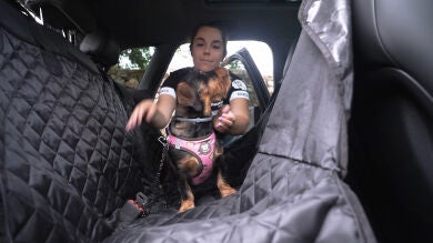 Colocaremos la funda que cubre los asientos traseros, que le separa del conductor y copiloto, en las barras de los reposacabezas, haciendo como una especia de hamaca. Subiremos a nuestra mascota con el arnés puesto y abrocharemos el cinturón al sistema de unión.