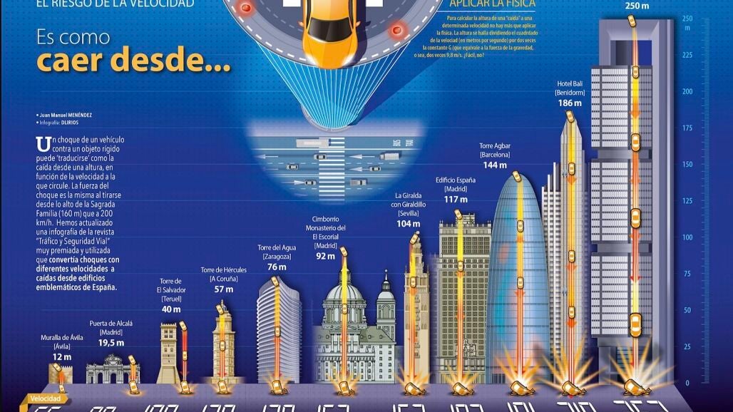 Y es que, cuando se sufre un accidente a una determinada velocidad contra un objeto rígido, la fuerza de este choque puede “traducirse” a una caída desde una altura considerable, como la de un edificio. A 120 km/h el golpe equivale a una cáida desde 57 metros de altura; a 139 km/h a 76 metros; a 153 km/h a 92 metros y a 172 km/h a 117 metros.