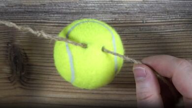 Para este truco tan solo necesitarás una pelota de tenis y un cordón. Con un punzón o un destornillador haz un par de agujeros a la pelota de tenis, por donde debes introducir el cordón y atarlo. Deja un buen trozo de cordón por el otro lado.