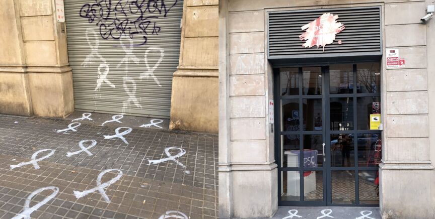 Si bien el martes el ataque fue para lassedes del PP y Ciudadanos, hoy le ha tocado a los socialistas. El PSC de Barcelona ha denunciado que su sede de la calle Consell de Cent, como has visto en el vídeo superior, ha amanecido con pintadas de lazos blancos en la persiana y parte del suelo. Es el segundo ataque con pintura que sufren en dos años.