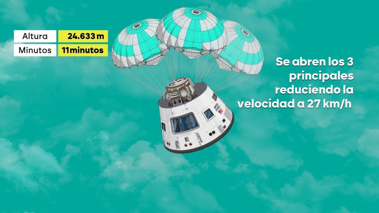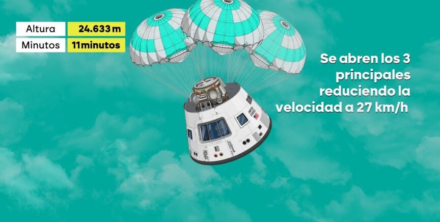 Una vez superada la separación del módulo de tripulación del de servicio, la nave 'Orión' entrará en la región subsónica, ese descenso de 10 minutos en los que se desplegarán dos paracaídas de frenado, que reducirán la velocidad hasta unos 493 km/h. Poco después, se abrirán otros tres paracaídas que permitirán desacelerar la cápsula hasta unos 27 km/h, velocidad a la que se producirá el amerizaje en el Pacífico, en una zona en la que se esperan condiciones meteorológicas favorables.