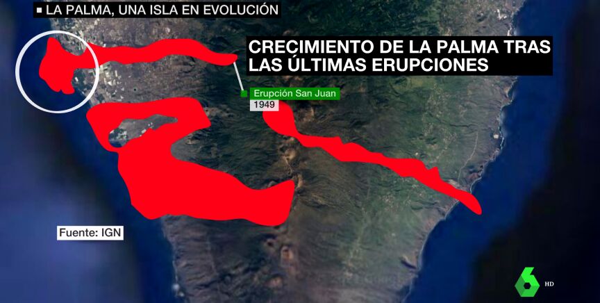 Los expertos determinan que cuando la lava llega al mar en La Palma, la isla crece una media de un centenar de metros cuadrados en el área de la desembocadura. Por ejemplo, en 1949, al chocar con el océano, la lava creó un delta que no existía antes de la erupción del volcán de hoyo negro.