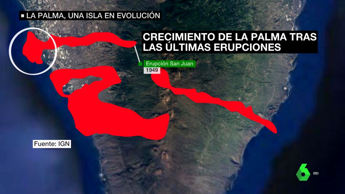 La Palma, con dos millones de años, y El Hierro son las islas más jóvenes de Canarias. La isla seguirá creciendo y, por el momento, los nuevos metros que genere esta erupción pasarán a engrosar el suelo público.