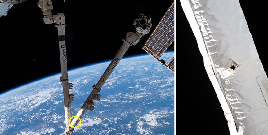 El brazo robótico Canadarm2, pieza fundamental de la Estación Espacial Internacional por su papel de mantenimiento de la Estación, ha sido dañado por basura espacial, tal y como informa la Agencia Espacial Canadiense. El organismo lo ha notificado tras realizar una inspección rutinaria el pasado 12 de mayo. Descubrieron que se abrió un agujero de cinco milímetros en el brazo y en su manta térmica.