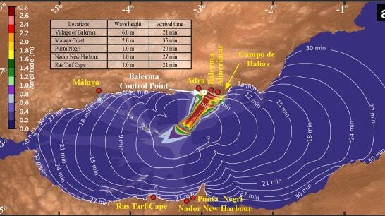 En el estudio se develan las zonas costeras próximasque podrían verse inundadas, así como la magnitud que podría alcanzar esta inundación en cada punto. Entre estos lugares podría verse afectada la zona de Campo de Dalías y el pueblo de Balerma, situados en la provincia de Almería. También, dependiendo de la trayectoria, llegaría a la costa malagueña y en la costa marroquí, en lugares como el cabo Ras Tarf, Punta Negri y el nuevo puerto de Nador.