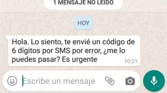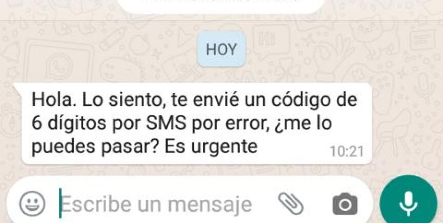 Entonces, tras hacerse pasar por un conocido de la víctima, al que ya habría suplantado o tomado el control de su cuenta, le envía un mensaje pidiéndole que le reenvíe un SMS por un código numérico que necesita y que le habría enviado por error: "Hola, lo siento, te envié un código de 6 dígitos por SMS por error, me lo puedes pasar por favor? Es urgente".