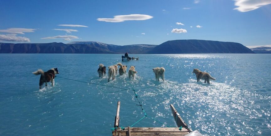 Varios perros tirando de un trineo en mitad del agua. Aunque pueda parecer una escena inusual en cualquier trópico, se trata de Groenlandia, donde el poco hielo que queda se está derritiendo a una velocidad vertiginosa.