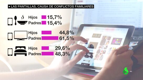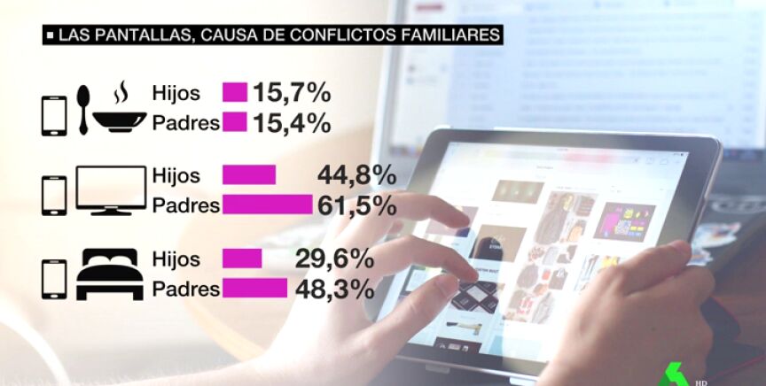 Dormimos menos y estamos más crispados. Cuatro de cada 10 padres y madres creen que tablets y móviles son la causa principal de conflictos en casa. El problema es que esta dependencia no afecta sólo a los menores: uno de cada tres progenitores reconoce que no se separa del móvil.