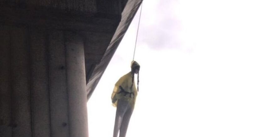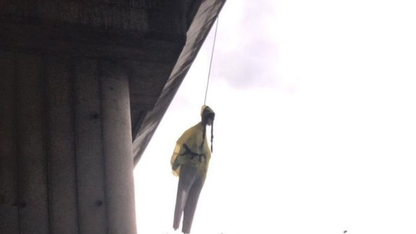 Un muñeco con el rostro de la activista Greta Thunberg aparece colgando en un puente de Roma