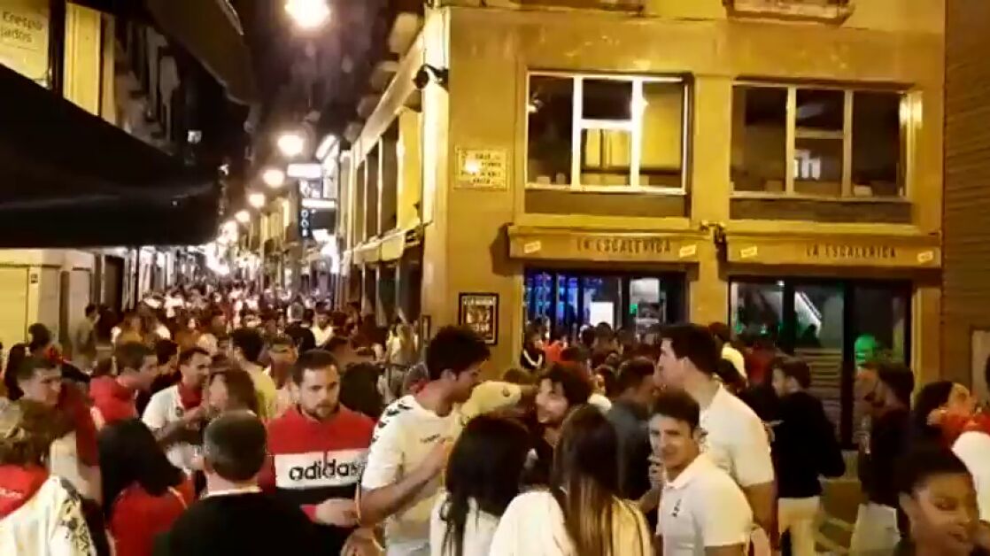 La primera noche de las que deberían haber sido las fiestas de San Fermín en Pamplona han dejado estampas de aglomeraciones puntuales de personas en el centro de la ciudad sin usar mascarilla.