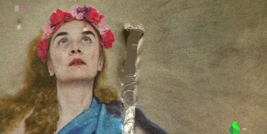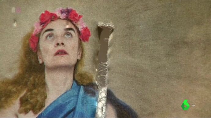 'Con flores a María', obra de la artista Charo Corrales, ha amanecido rajada. El fotomontaje muestra a una Inmaculada Concepción de Murillo con la cara de la artista y mostrando su pubis. Un gesto que hizo que PP, Ciudadanos y Vox pidiesen su retirada por considerarlo un insulto a las creencias religiosas.