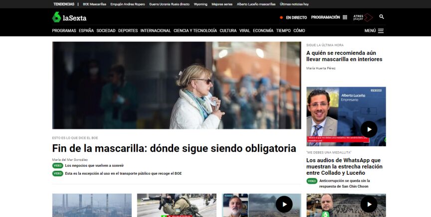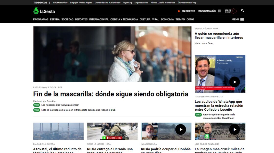 laSexta continúa con su posición como referente de información y actualidad con su seguimiento a la evolución de la pandemia y a la situación del país, a los que se añade el conflicto internacional de la guerra con la cobertura especial desde laSextaNoticias y formatos como 'laSexta Noche', 'El Objetivo de Ana Pastor', 'Más Vale Tarde' o 'La Roca'. También en el entretenimiento y la actualidad de 'Zapeando', 'Jugones', 'El Intermedio' o 'El Chiringuito de Jugones', además de las nuevas entregas de 'Lo de Évole' y el estreno del nuevo programa de Mamen Mendizábal, 'Encuentros inesperados'.