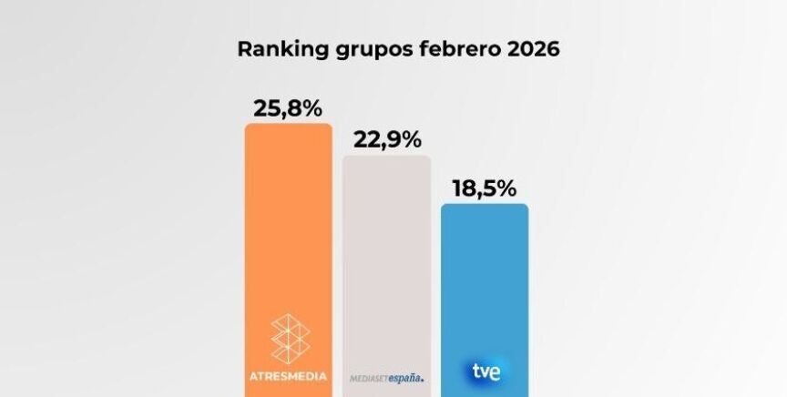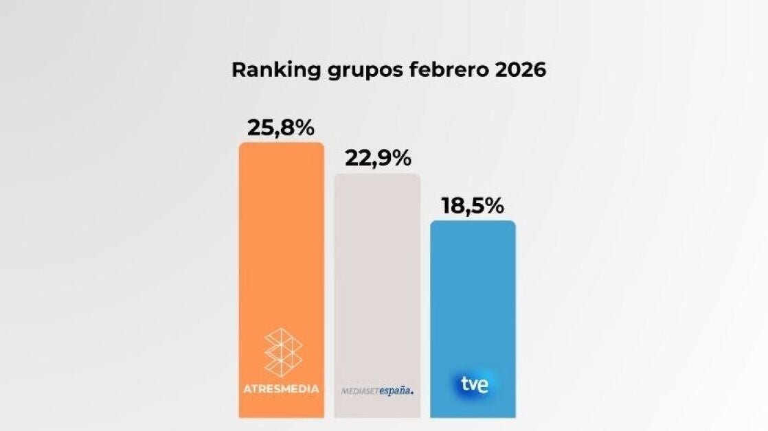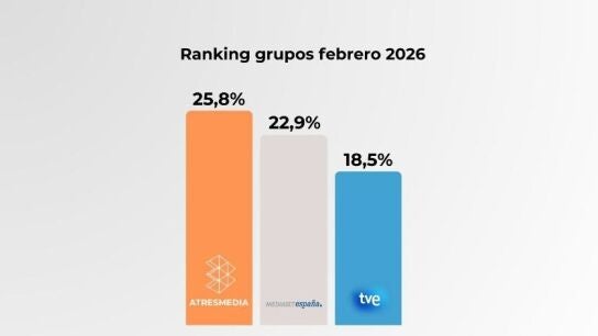 Atresmedia se mantiene como el grupo líder de audiencia a pesar de tener un canal menos que su competidor, acumulando 34 meses consecutivos en la cima. En febrero, lideró el 'prime time' con una cuota del 26,1% y superó a su rival por 4,6 puntos. También dominó la sobremesa y la tarde, especialmente de lunes a viernes. laSexta tuvo su segundo mejor mes de la temporada, destacando programas como Aruseros, Lo de Évole y El Intermedio. Antena 3 lideró febrero con la mayor ventaja en 30 años, destacando en informativos y entretenimiento, con 'El Hormiguero' y 'Pasapalabra' como programas más vistos.
