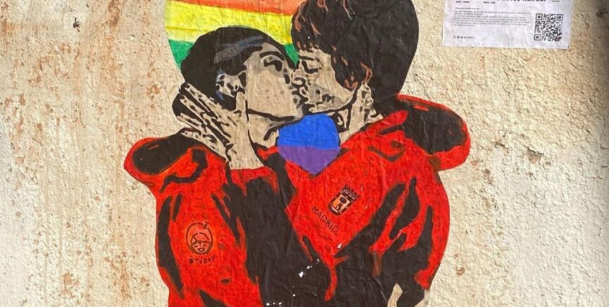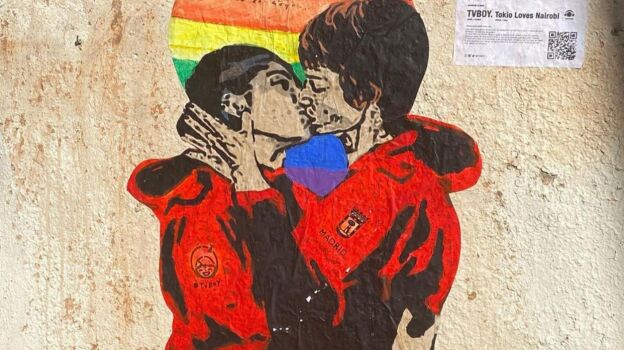 "El amor libre y sin barreras de género" es el tema de la última pintura del artista TvBoy. El grafitero ha representado en pleno barrio madrileño de Chueca a Nairobi y Tokio, dos de las protagonistas de La Casa de Papel, dándose un beso.