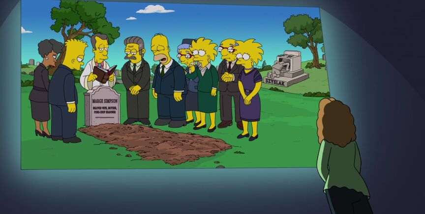 La muerte de la madre de la familia Simpson "tiene lugar" en el último episodio de la temporada 36, en emisión actualmente, y colocamos comillas en "tiene lugar" porque efectivamente se puede ver en este capítulo, pero ocurre realmente en un futuro relativamente lejano. 'Estranger Things' es el título del episodio, en una especie de parodia a la popular serie 'Stranger Things', incluye un flash forward en el que se puede ver que Marge fallece, 35 años después.