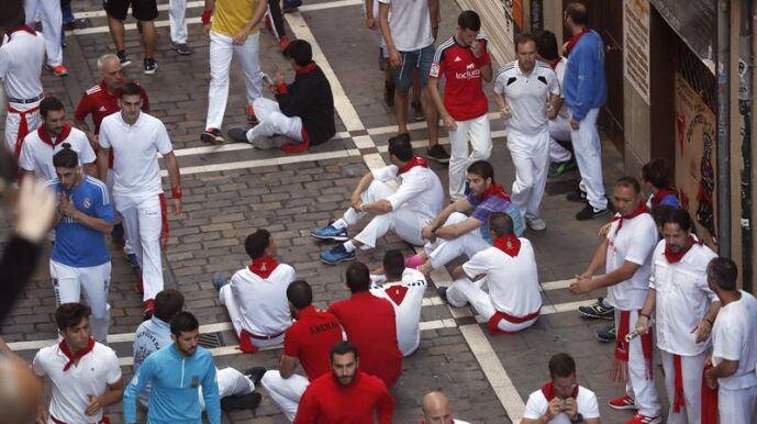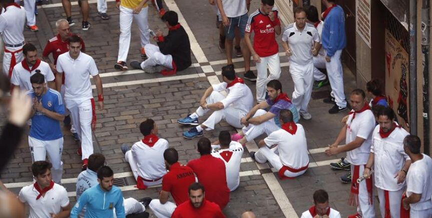 Especialmente en Estafeta y Mercaderes, decenas han decidido sentarse en el suelo al finalizar el segundo cántico a San Fermín antes de la carrera para protestar contra la "desnaturalización" de los encierros.