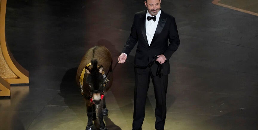 Al escenario también se subió uno de los personajes más enternecedores de 'Almas en pena de Inisherin', la burra Jenny, que ha aparecido sujeta por Jimmy Kimmel, con un lazo rojo al cuello.