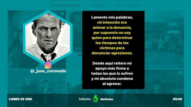 Tras estas palabras, Coronado ha publicado un mensaje en su cuenta de Instagram en el que se disculpa por sus palabras, aclarando que la intención que tenía era "animar a la denuncia". "Por supuesto no soy quién para determinar los tiempos de las víctimas para denunciar agresiones. Desde aquí, reitero mi apoyo más firme a todas las que lo sufren y mi absoluta condena al agresor", zanja el actor.