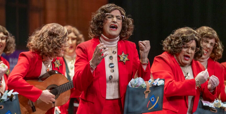 Y se jactaba de que "la que parte y reparte se lleva la mejor parte" y cantaba "amigos para siempre" a excompañeros del partido y el Gobierno, como Santos Cerdán, José Luis Ábalos y Koldo García", hasta que les mandaron a la cárcel, porque a partir de entonces: "Amigos tampoco, tú sabes...., de vista". También la chirigota critica que en el Congreso le llamen "vulgar poligonera" y se metan con su acento andaluz, algo que la anima a dejar Madrid para ser candidata a presidir la Junta de Andalucía. Pero también en esta chirigota que parodia a la ministra de Hacienda se han colado las críticas al presidente andaluz, Juanma Moreno, por la gestión sanitaria y las crisis de los fallos en los cribados de cáncer de mama, uno de los temas que más está acaparando la atención de las coplas carnavaleras.