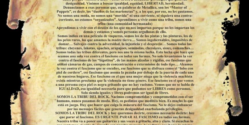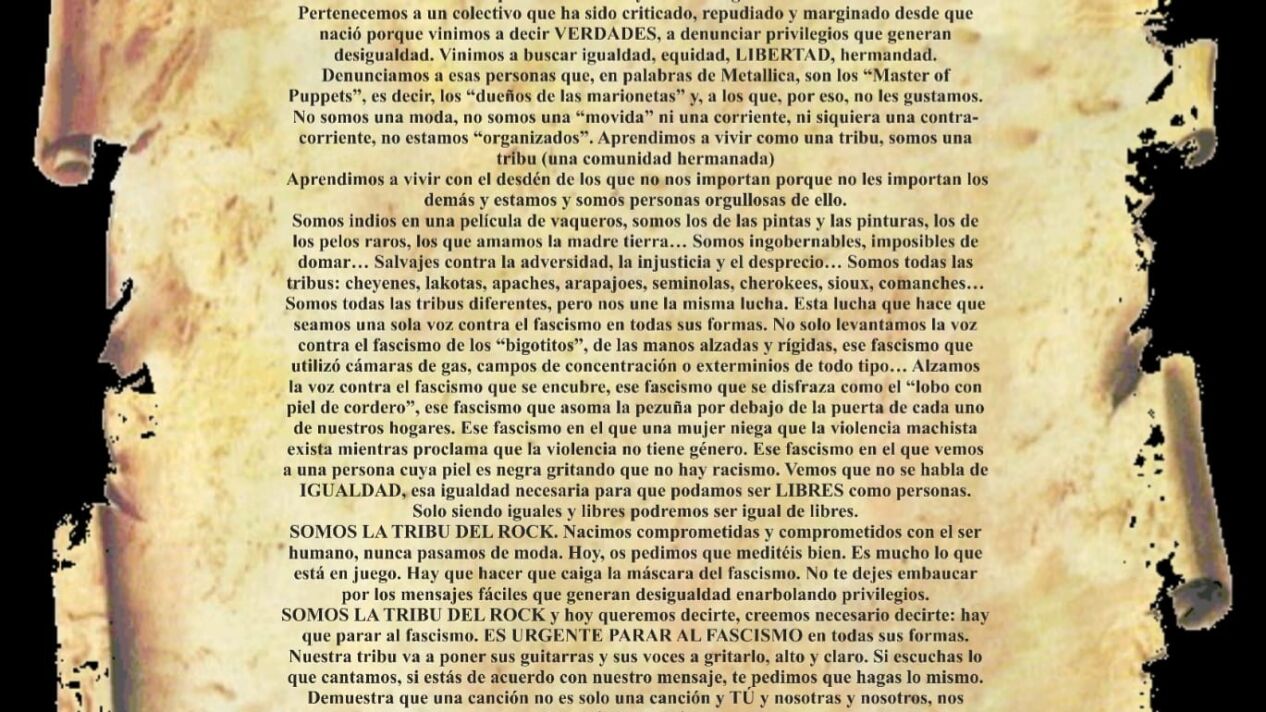 "Somos la tribu del rock y hoy queremos decirte, creemos necesario decirte: hay que parar al fascismo". Es una de las frases que recoge el manifiesto respaldado por más de mil bandas de rock españolas y extranjeras que llama a "parar al fascismo en todas sus formas".