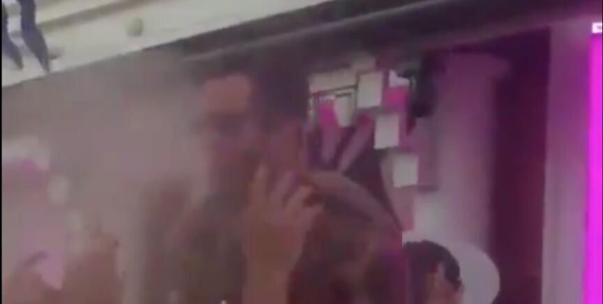 No sólo eso. Según se aprecia en las imágenes, en un momento dado de la actuación un miembro de Les Castizos aparece subido a una barra escupiendo sobre el público después de haber ingerido alcohol. Pero este hecho no pareció preocupar al artista ni a los asistentes, que según se aprecia siguen bailando y festejando con normalidad.